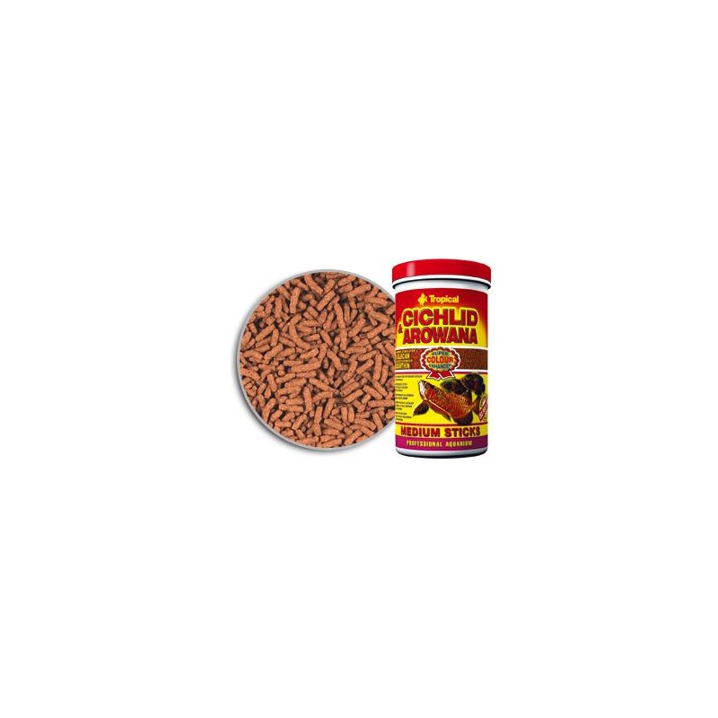 Sticks (pellet) ideal para peces grandes (Oscares, Arowanas u otros). Es un alimento completo y altamente calórico en forma de barritas flotantes. Contiene estimuladores naturales que ayudan al sistema inmunológico. Alimento completo que estimula el colorido de los peces.